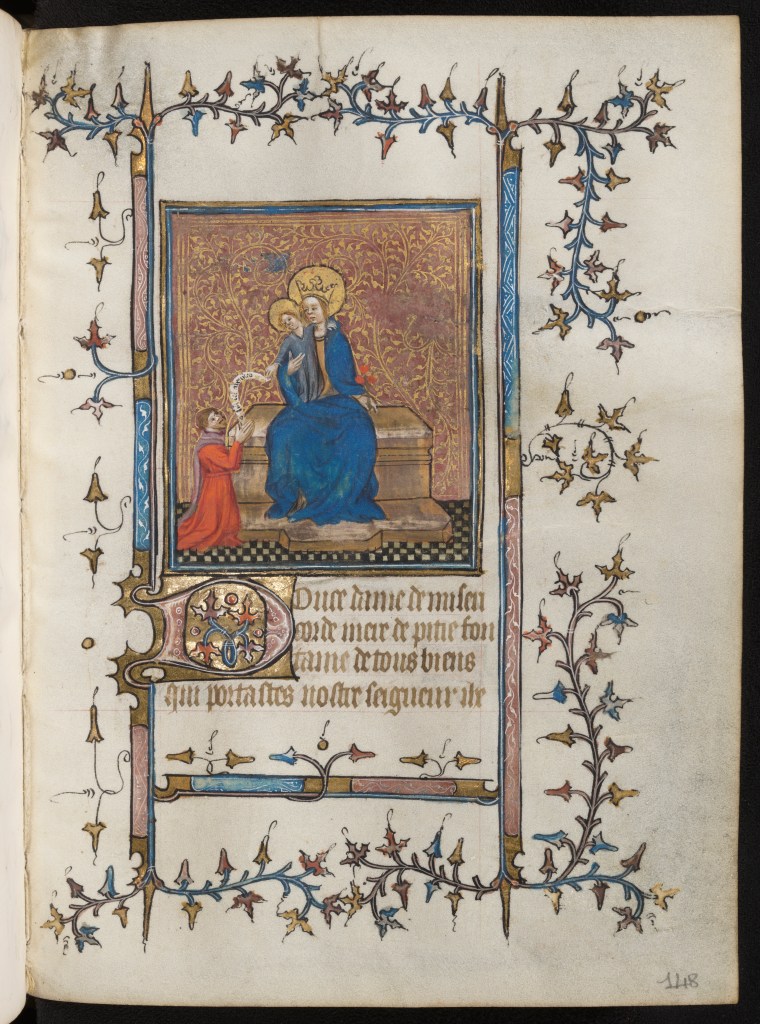 Im Bild, das den Gebetstext der „Fünfzehn Freuden der Jungfrau Maria“ einleitet, sehen wir die thronende Maria mit dem Christuskind. Die drei roten Rosen in Marias linker Hand verweisen auf das zukünftige Blutvergiessen Christi am Kreuz. Der kniende Mann stellt wahrscheinlich den ersten Besitzer dieses Stundenbuchs dar. Eine Schriftrolle verläuft von ihm zum Christuskind, das sein Gebet wohlwollend aufnimmt.
