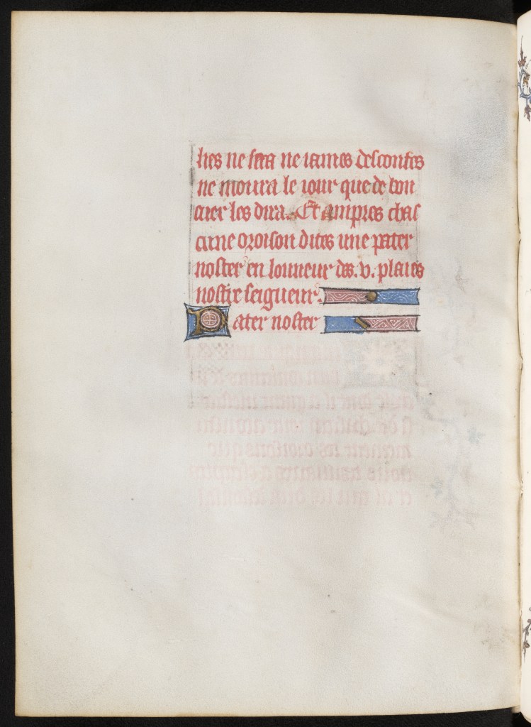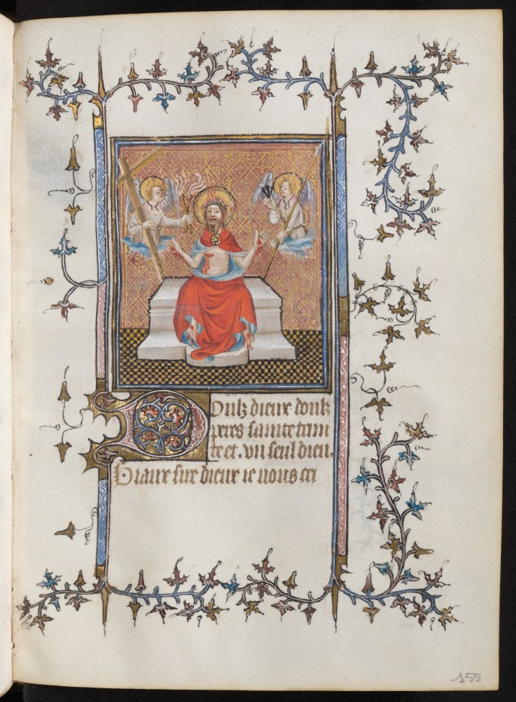 Das Gebet der „Sieben Bitten an unseren Herrn“ (Les VII requêtes Notre-Seigneur) wird normalerweise von einer Darstellung der Dreifaltigkeit begleitet. Dieses Stundenbuch weicht von dieser Tradition ab. Obwohl das Bild das Leiden Christi und die Instrumente seiner Passion stark betont, wirkt die Gestalt Christi wenig schmerzerfüllt und blickt den Betrachter ruhig an. Vielleicht orientiert sich das Bild in dieser Hinsicht an dem Gebetstext. Dieser beschreibt mehrmals die Leiden Christi mit dem französischen Wort „doulz“ (süss). Diese scheinbar paradoxe Bezeichnung der Schmerzen Christi als süss ist ein Kennzeichen der spätmittelalterlichen Frömmigkeit. Die Aufnahme dieses französischen Gebets und seines ungewöhnlichen Bildes zeigt deutlich, dass dieses Stundenbuch nach den besonderen Wünschen des Auftraggebers gestaltet wurde.