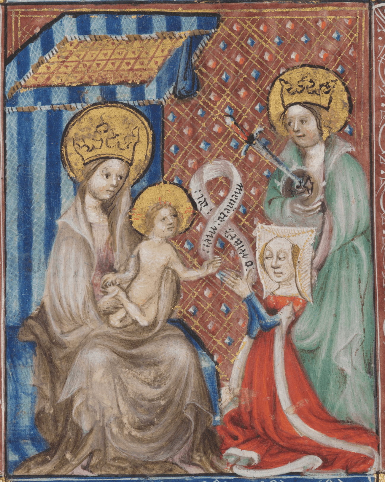 Spannenderweise finden sich in der Handschrift Hinweise auf eine spätere Besitzerin. Ein Bild für das Totenoffizium zeigt ungewöhnlicherweise die Heilige Katharina, die Maria und dem Christkind eine kniende Frau präsentiert. Dies könnte darauf hindeuten, dass das Stundenbuch in den Besitz einer Frau namens Katharina gelangte, die sich und ihre Namenspatronin in der Handschrift darstellen liess.