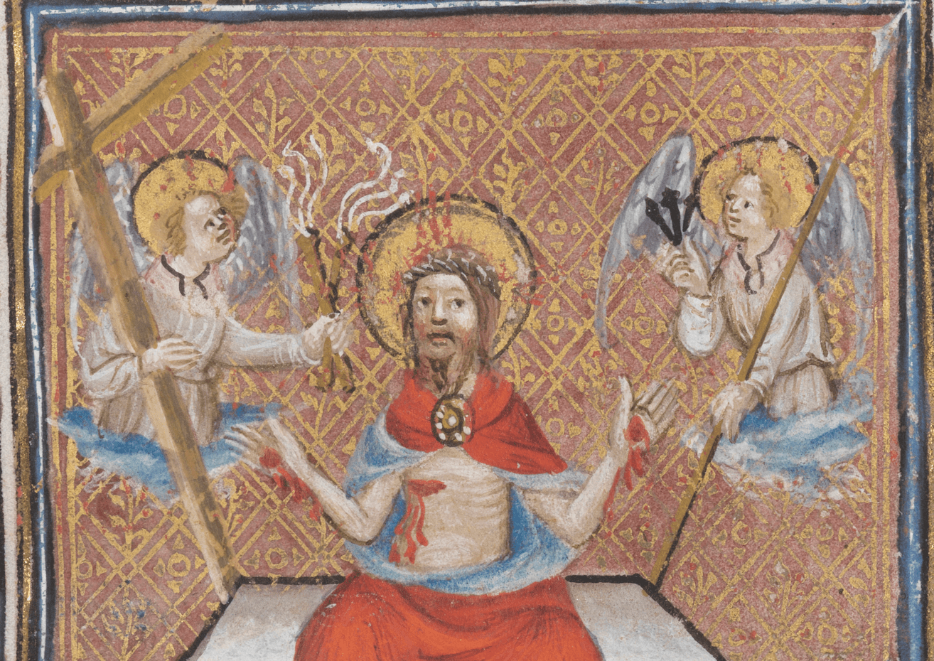 Das Bild, das das Gebet der „Sieben Bitten“ eröffnet, zeigt Christus als thronenden Schmerzensmann, mit Dornen gekrönt und aus seinen Wunden blutend. Flankierende Engel tragen die Instrumente seiner Passion: Kreuz, Nägel, Lanze und Peitsche. Der starre Blick Christi, das tiefrote Blut und die Zurschaustellung der Folterwerkzeuge konfrontieren die Betrachter:innen mit seinem Leiden, während sie um seine Hilfe beten.