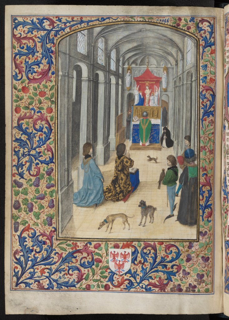 Dieses Laien-Brevier gehörte wohl Guy de Brimeu, einem Gefährten von Karl dem Kühnen, Herzog von Burgund. Auf diesem Bild, das die Psalmen einleitet, kniet Guy während eines Gottesdienstes in einer Kirche. Sein Gebetbuch liegt auf dem Pult vor ihm und sein höfisches Gefolge umgibt ihn. Die prächtige Miniatur spiegelt Guys Hoffnung wider, trotz seiner irdischen Verpflichtungen mit Hilfe seines Gebetbuchs eng an den Riten der Kirche teilnehmen zu können.